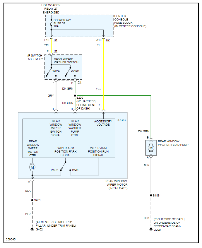 Next we need to check the power at the rear wiper motor. If you have voltage then the wiper motor is the issue. If you don't have voltage we need to check voltage coming out of the switch in the IP. If you have voltage coming out of the switch but not at the motor then you have a wiring issue.