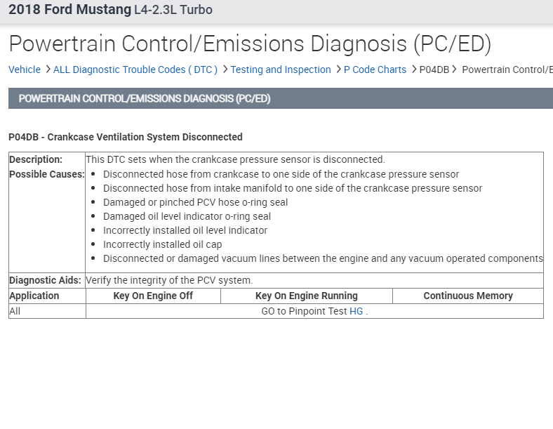 I have the car listed above eco boost, with only a cold air intake installed. I was driving home from work and the check engine light came on. So, I plugged in my OBD reader and the code P04DB appeared, and it says Crankcase Ventilation System Disconnected. Any idea what I can change or mess with to fix?