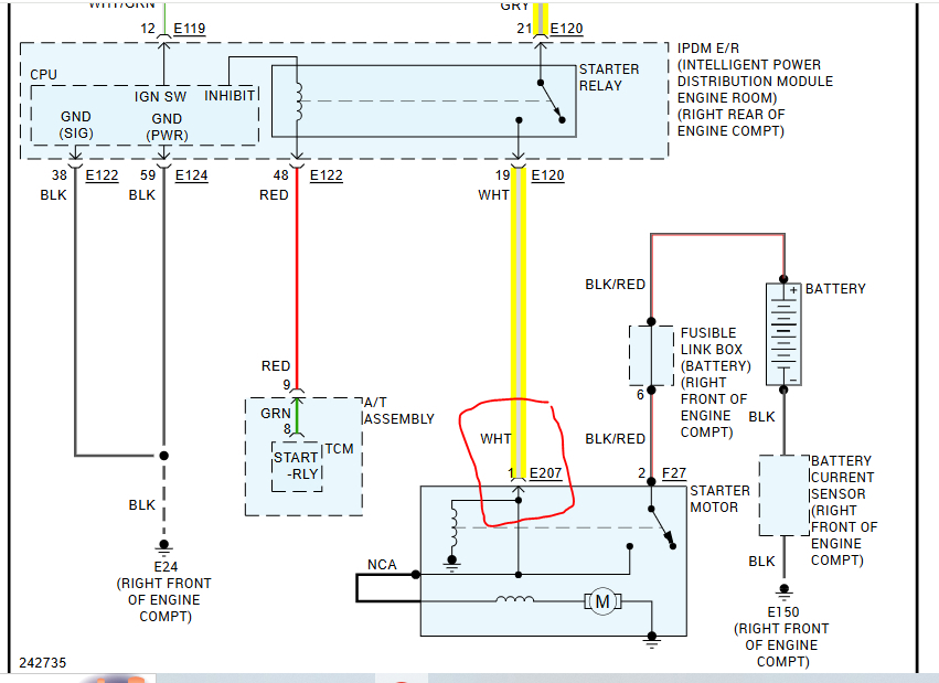 The starter relay is located in the intelligent power distribution box under the hood. Is that where the clicking is coming from? Also, there is a fusible link at the battery (fusible link box) mounted to the positive battery terminal. Fusible link J needs to be checked. If it is good, we need to check the relay itself.