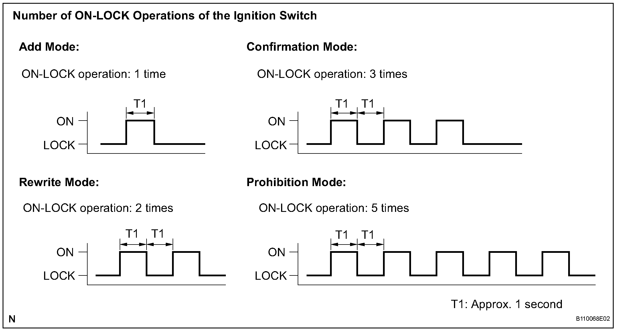 6. Turn the ignition switch from the ON to the LOCK position at approximately 1 second intervals according to the number of times given as the illustration.