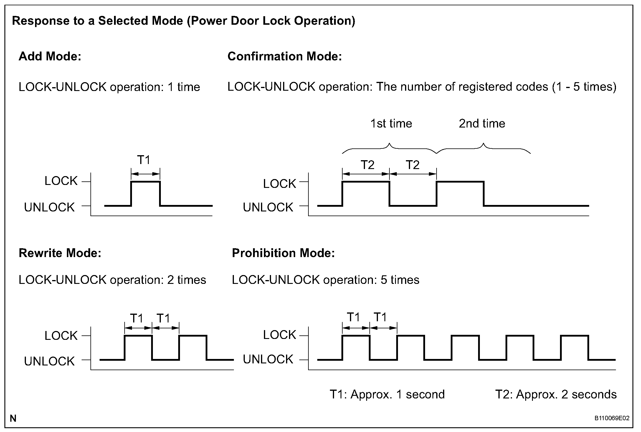 8. The body ECU automatically performs the power door LOCK-UNLOCK operation with in 3 seconds after the mode has been selected and informs the technician of the selected mode using the response patterns as given in the illustration.