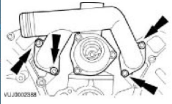 Install NEW sealing rings to the coolant outlet pipe grooves. Install the outlet pipe to the bypass hose and cylinder heads. See Fig. 99. Install the 4 coolant outlet pipe bolts and tighten to specification. See TORQUE SPECIFICATIONS.