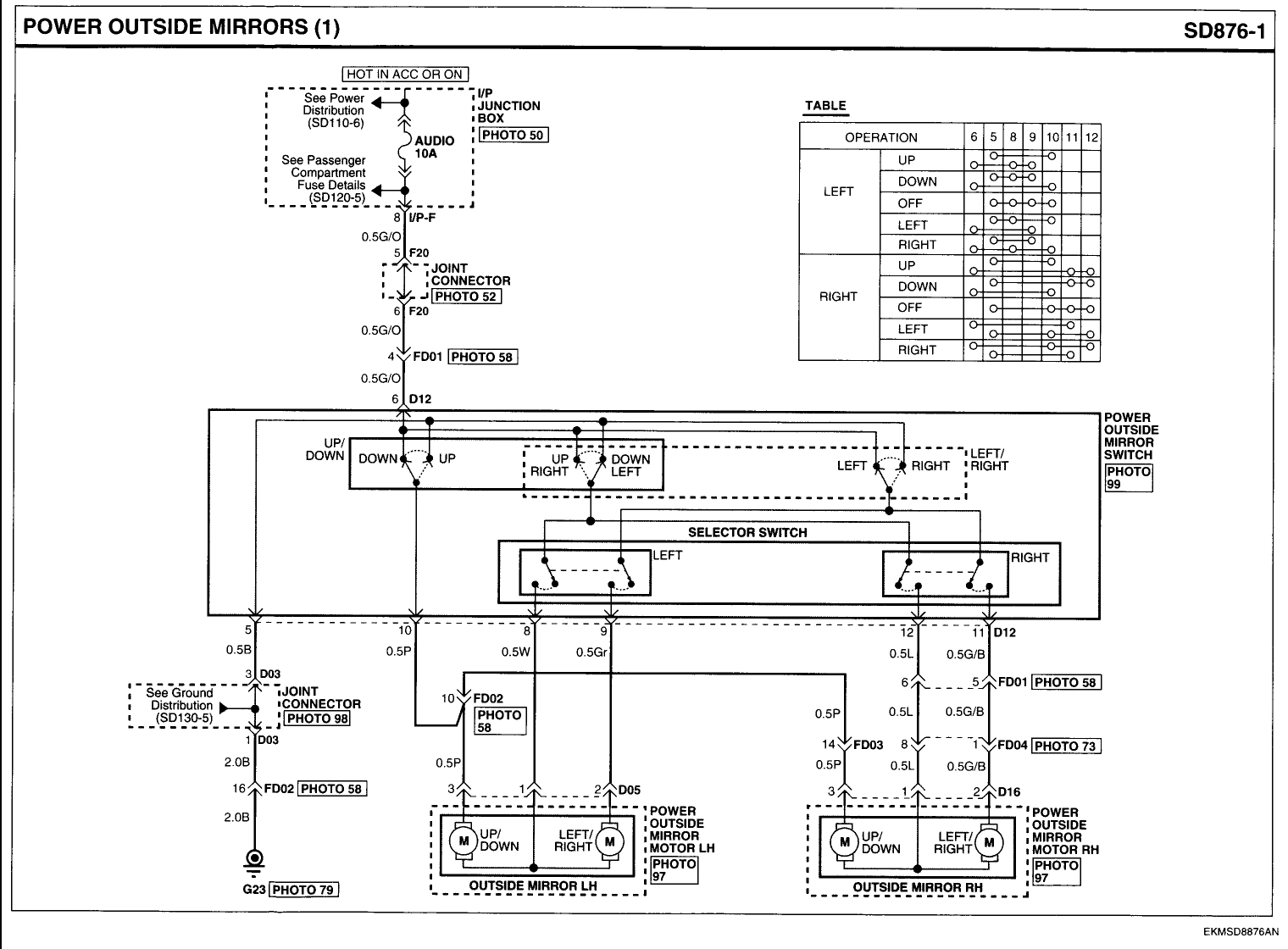 The charts show the terminals and how they connect for each mirror motor. Use a simple continuity tester or a meter with that function to test the switch.