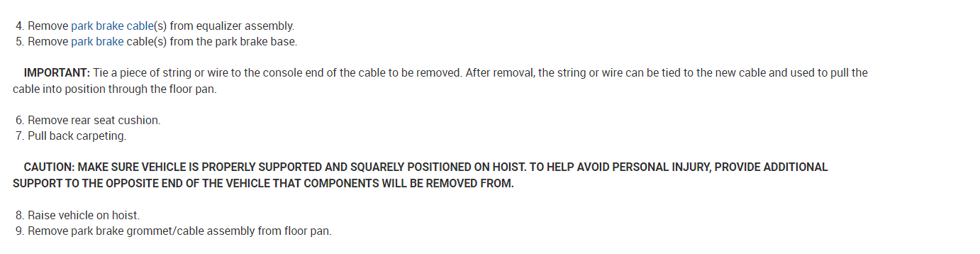 I hope this helps. Again, the pics below show the removal and replacement procedures and relevant pics which correlate with the directions. The first 4 pics are for the equalizer cable. Pics 5 through 13 are for drum brakes and the remaining are for disc brakes.