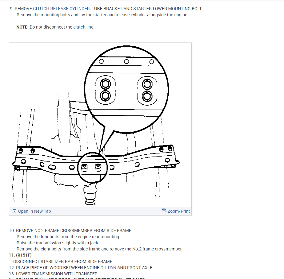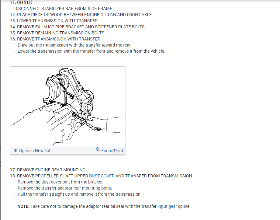 If you have a transmission jack then I would just follow those steps that they layout from the manual that I attached previously. It says that you must remove the exhaust pipe but not the sway bar. Then take the transmission and transfer case out together.