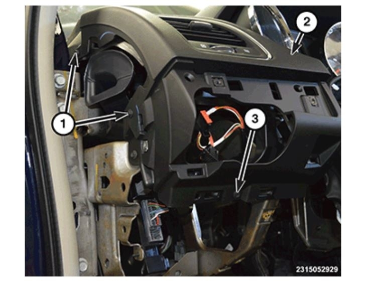 Remove two screws (1) on the left side of the instrument panel pad (2).
