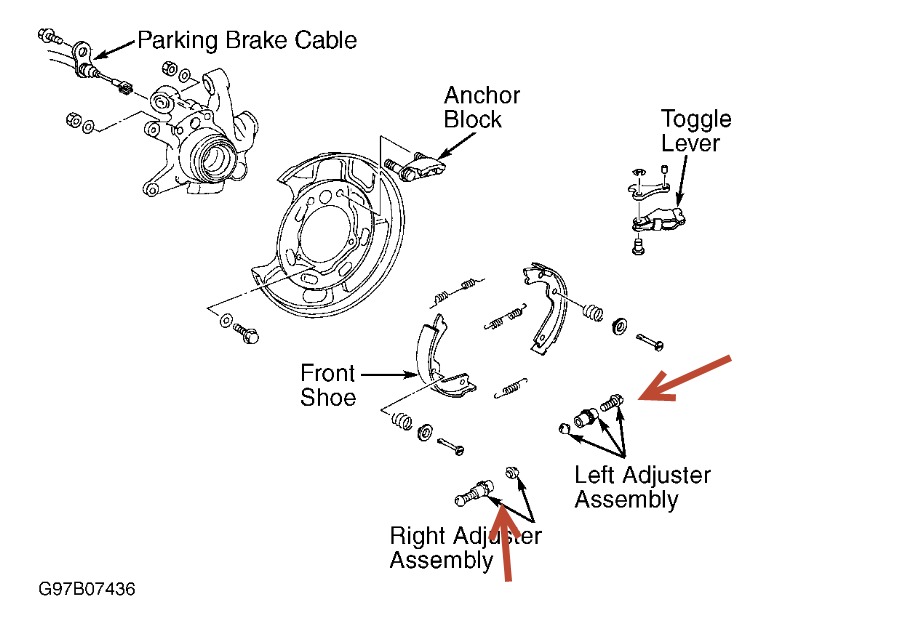 I am assuming the calipers are already off so you will have to see if you can release the adjusters I have pointed out in pic to pull rotor off.then you can get to shoes. the caliper is held by two bolts going through from the back.also the caliper bracket wil need to come off.