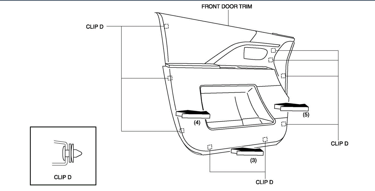 7. Pull in the direction of the arrow (3), (4), (5) shown in the figure and remove clips D from the front door trim.