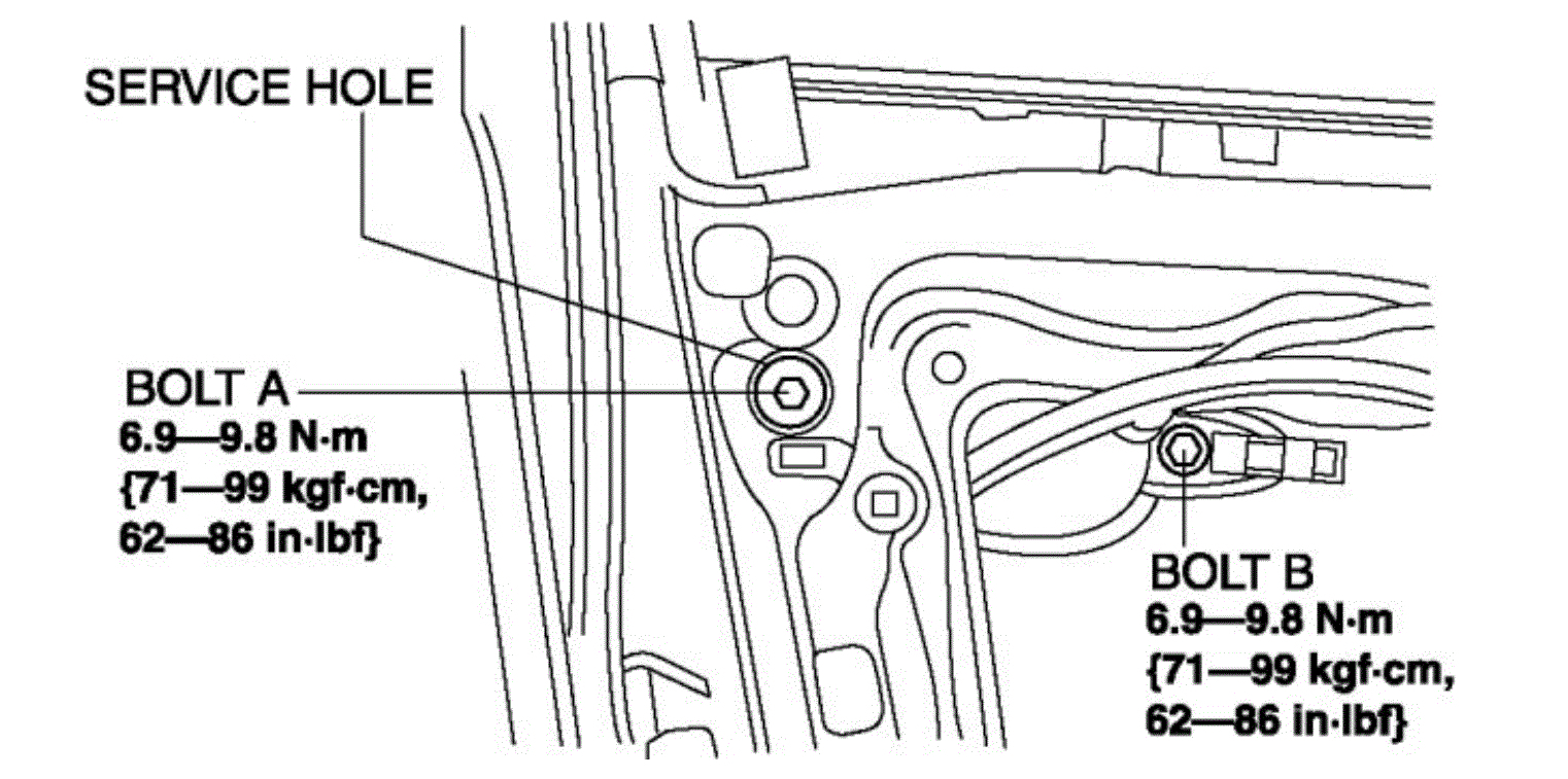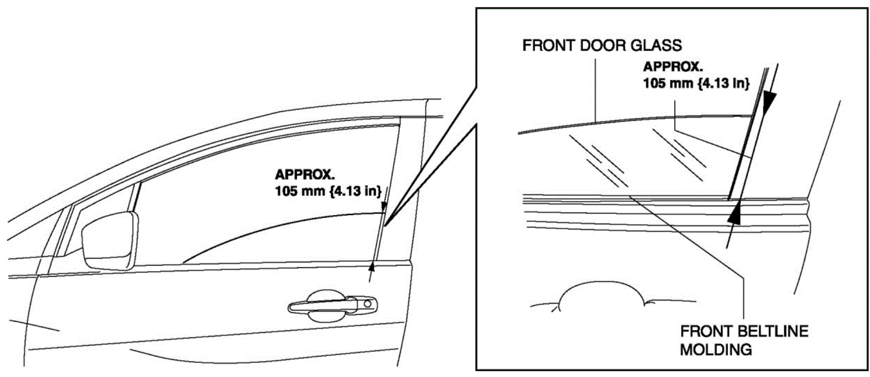 1. To access the glass installation bolt, adjust the position of the front door glass so that the height of the door glass towards the rear is approx. 105 mm {4.13 in}.