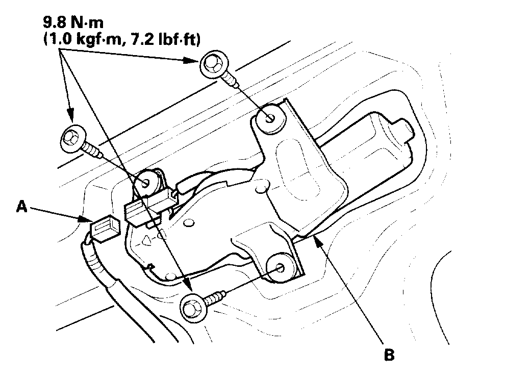 3. Disconnect the 4P connector (A) from the rear window wiper motor (B).
