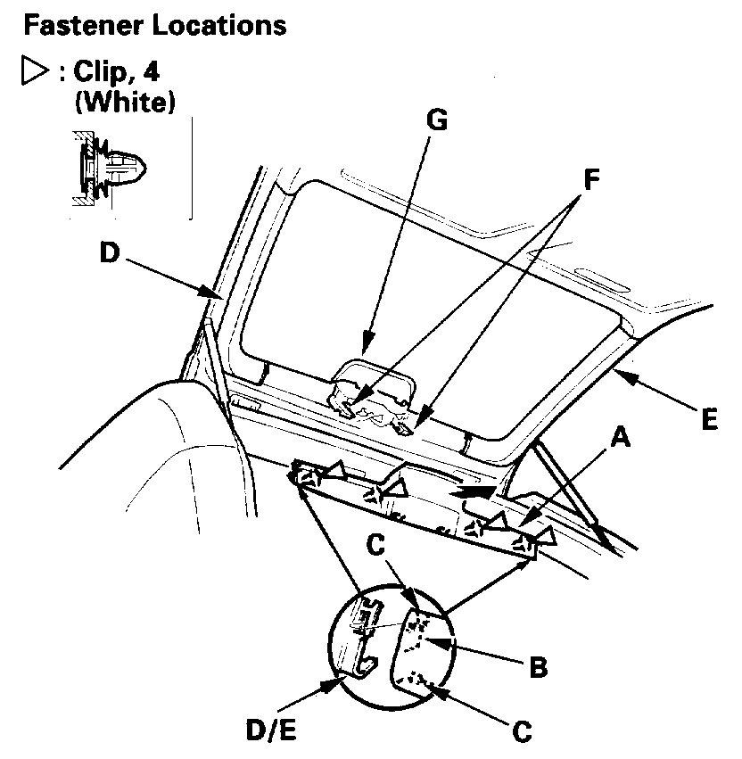 3. Pull out the trim panel to detach the clips (F), and pull the trim panel up.