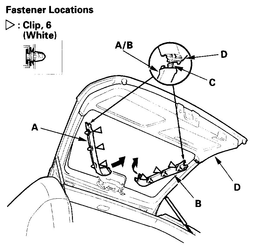 2. Release the hooks (C) from the tailgate lower trim panel (D).