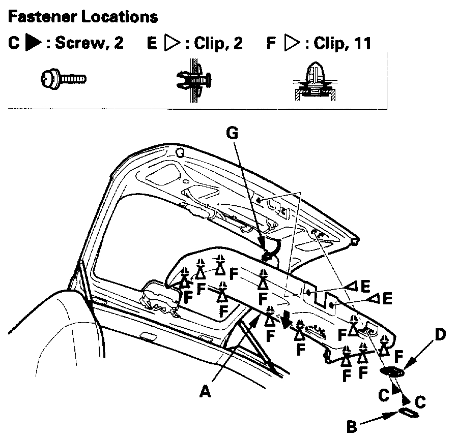 2. Pull the tailgate upper trim back by hand to detach the clips, and release the hooks (F) on the high-mount brake light (G).
