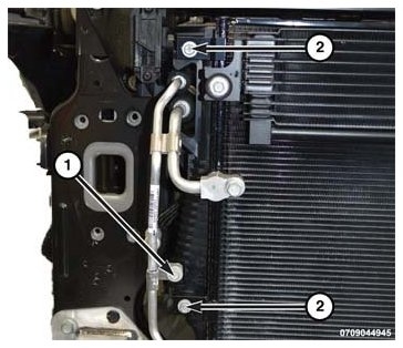 6. Remove the left side condenser mounting bracket bolts (2) from the radiator.