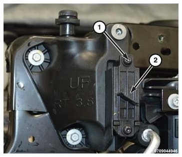 9. Remove the bolt (2) from the A/C service port support bracket (1) and position aside.