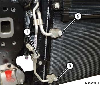 11. Install the left side condenser mounting bracket bolts (2) and tighten the bolts to the proper torque specifications .