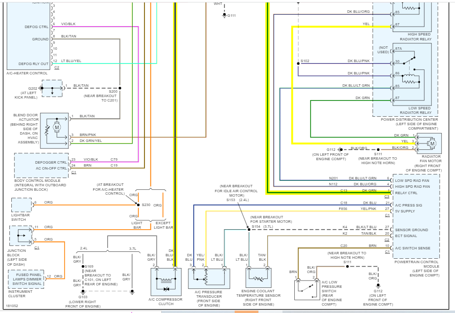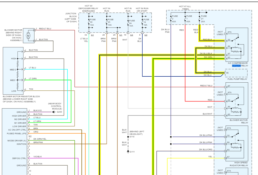 If that checks good, check for continuity from where pin 87 goes into the box and the dark blue wire with a black tracer connects at the compressor clutch. If the wire tests good, at this point we are done with the secondary side of the relay.