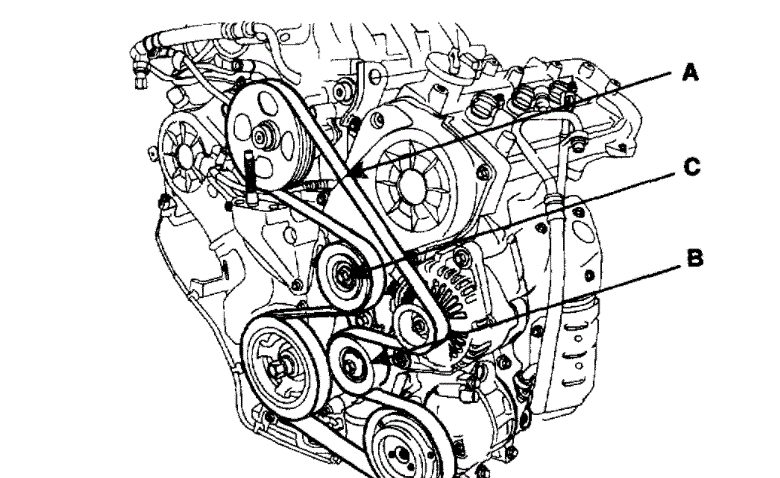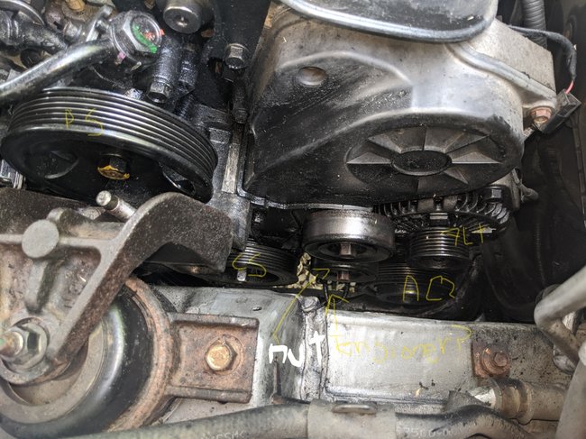 There are 6 pulleys on this vehicle and I have the tensioner narrowed down to two pulleys in the center that are not grooved, as I have identified the Crankshaft, alternator, power steering, and what I believe to be the A/C compressor.