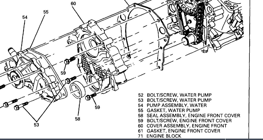 That sounds good, thank you Roy. Your diagram clearly shows the gaskets for the water pump, the timing cover to block, and the crank seal, but what precautions do I need to take when I put it back together to make sure I do not get an oil leak from the oil pan or from the oil pan/timing cover joint? When I separate them (even if I am careful), am I likely to tear the oil pan gasket? Is there a gasket or seal I should replace between the the pan and cover or do they just butt together? Just apply RTV?