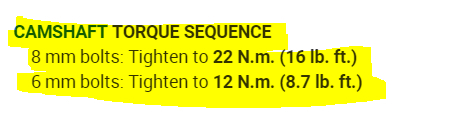 I need to replace all the gaskets top and bottom ones spark plug seals. How much torque is needed to put camshaft back on? Thanks in advance.