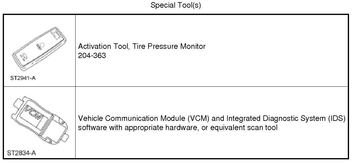 NOTE: If the vehicle has been stationary for more than 30 minutes, the sensors will go into a "sleep mode" to conserve battery power. It will be necessary to wake them up so they will transmit the latest tire pressure information to the Smart Junction Box (SJB). For additional information, refer to Tire Pressure Monitoring System (TPMS) Sensor Activation See: Tire Monitoring System > Programming and Relearning.