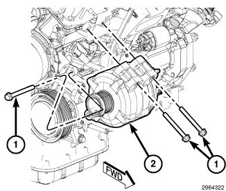 1. Position the generator (2) to the engine and loosely install the upper and lower retainers (1).