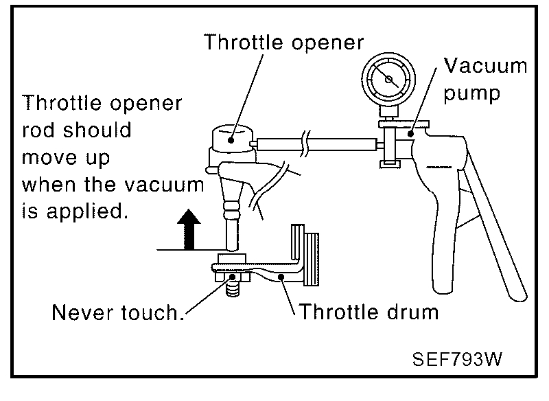 5. Apply vacuum [more than -40.0 kPa (-300 mmHg, -11.81 inHg)] until the throttle drum becomes free from the rod of the throttle opener.