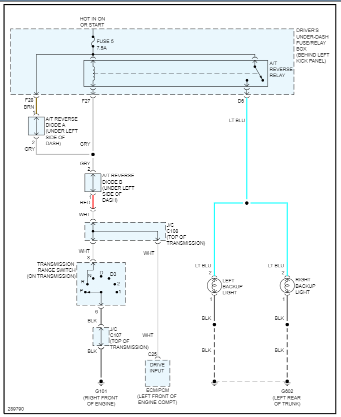 The reverse light switch is located on the transmission as part of the gear range sensor/switch. Here are the wiring diagrams for the system and the sensor/switch location in the images below. Please let us know if you need anything else to get the problem fixed.