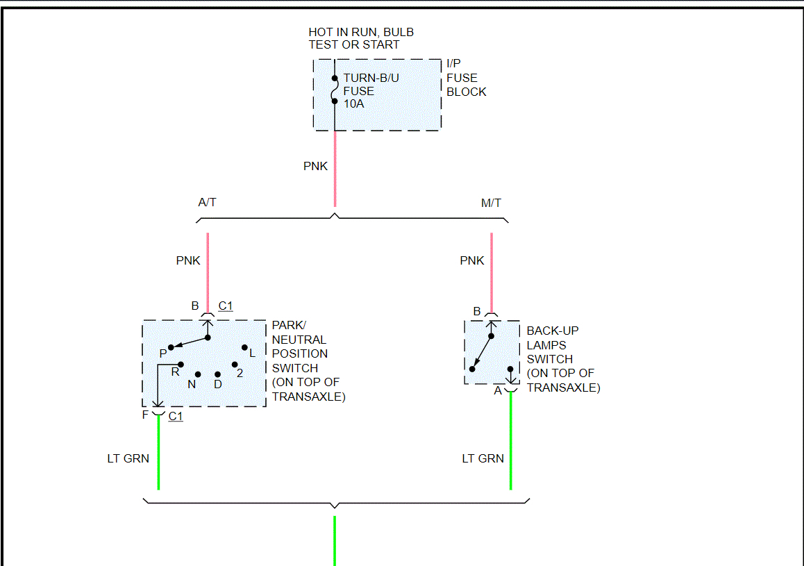 IF there is no power to the green wires, go to the backup lamp switch at the top of the transmission and see if there is power to the green wire there. If there is, there is an open between the switch and the lights. If there isn't, check the pink wire to the switch for power. If there is power, replace the switch. If there is no power, then check for power at the fuse in the instrument panel fuse box.