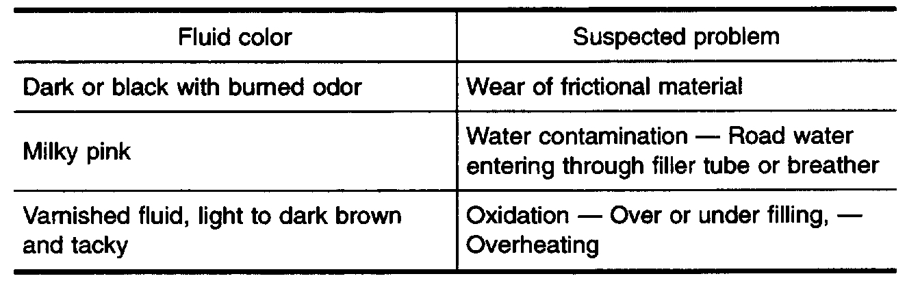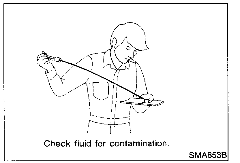 - If fluid is very dark or smells burned, refer to "Checking operation of A/T". Flush cooling system after repair of A/T.