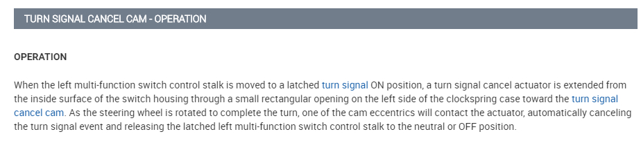 If this is the case, I suspect the multi function switch is the issue. There is a lock that holds the lever up and then a cancel latch pops out and when you turn the wheel it catches the stalk and turns it off.