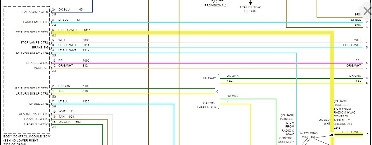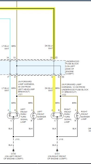Hello, the right front turn signal does not work. The right rear signal flashes quickly. There is no power going from engine compartment fuse panel to the blue wire with the white stripe that operates that signal. I can find no fuses blown in the engine compartment or the drivers's seat compartment. I do not have the schematics necessary for me to check the BCM. I cannot find the fuses that operate the turn signals. Suggestions?