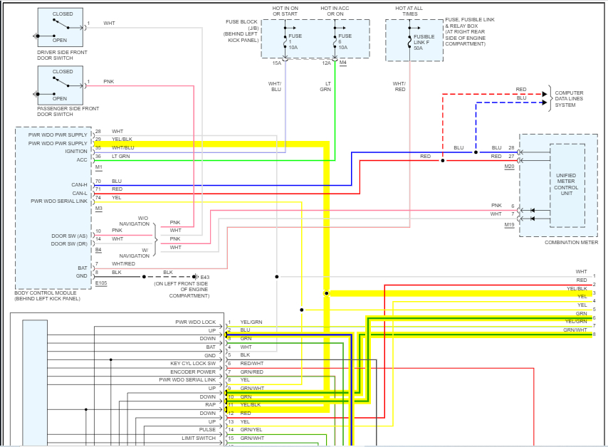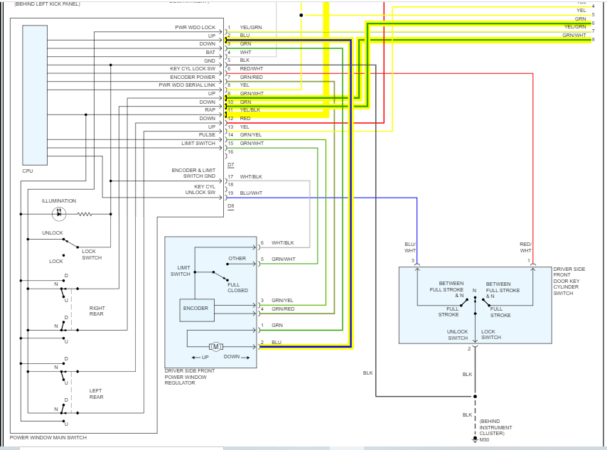 I do not have a solid green wire on my window switches as indicated on your wiring diagram. I only have a solid green wire on the main switch on the front driver side window.