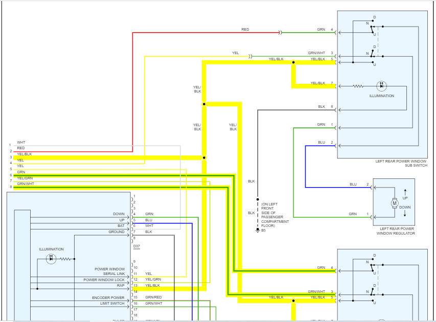 1) The good left rear window switch had power on the green white stripe wire and the green yellow stripe wire.