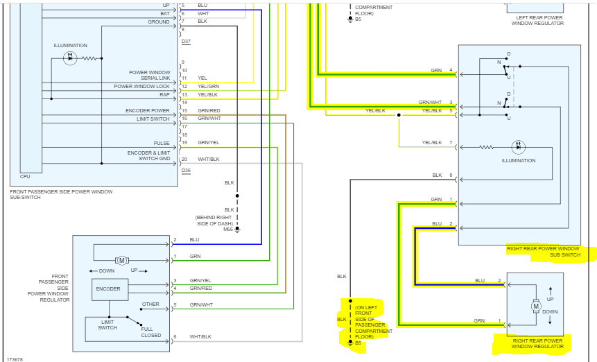 2) When checking the continuity on the green yellow striped wire on the bad right rear power window switch, I also only get clicks coming from the bad right rear power window switch.