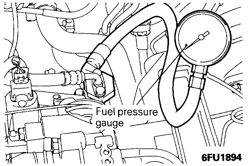15. Stop the engine and check for a change of the value indicated by the fuel pressure gauge. The condition is normal if there is no decrease of the indicated value within two minutes.