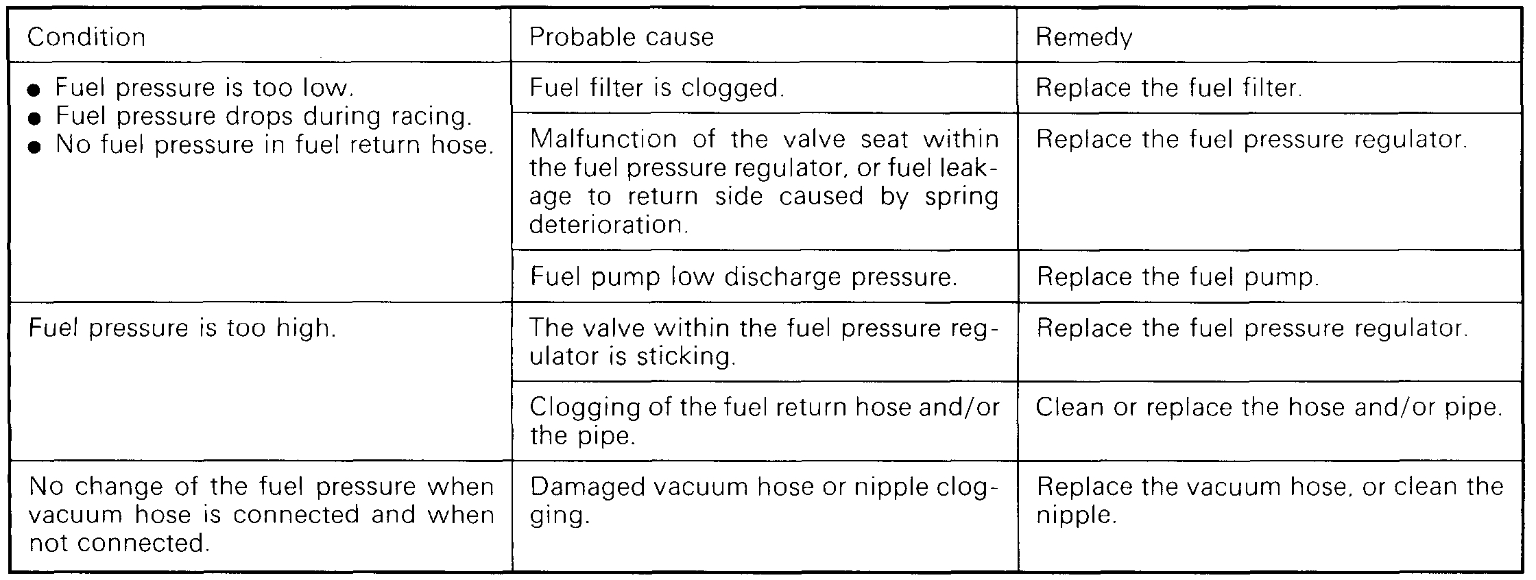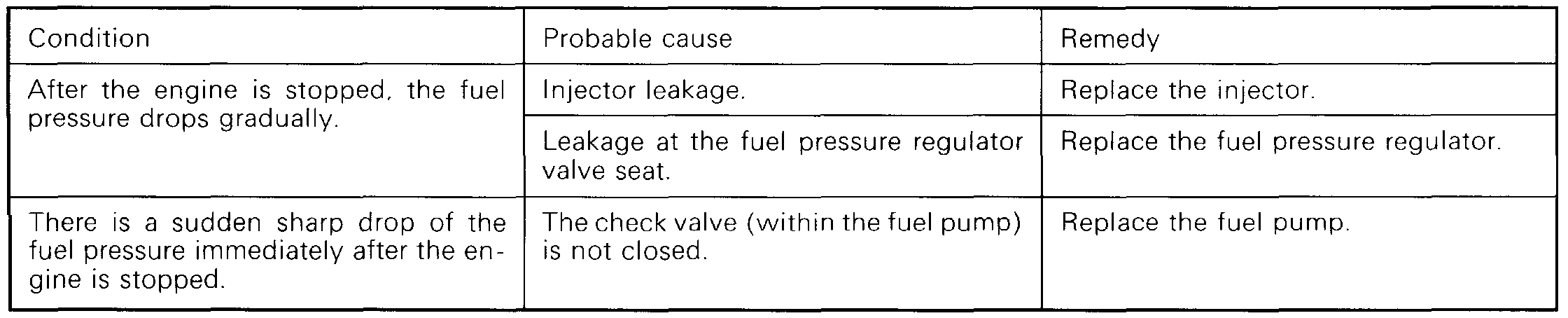14. If the fuel pressure measured in steps (9) to (12) deviates from the standard value range, check for the probable cause by referring to the table below, and then make the appropriate repair.