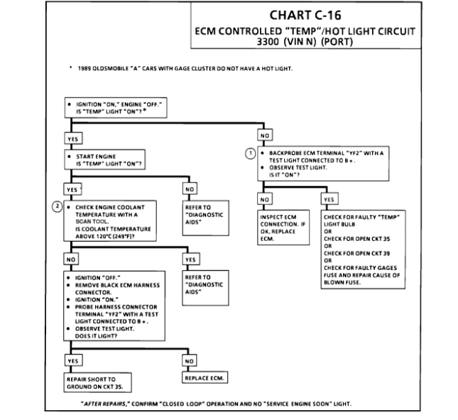 The coolant temperature sensor in rare cases, may fail to indicate the correct engine coolant temperature without setting a trouble code. This could result in turning "ON" the "TEMP" light without having a overheating condition. It could also result in overheating without the "TEMP" light being turned "ON." See coolant sensor temperature vs resistance values on trouble Code diagnostic chart Code 15. Compare coolant temperature reading from scanner to this chart. Replace coolant temperature sensor if mis-scaled.