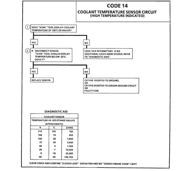 2. This test will determine if circuit 410 is shorted to ground which will cause the conditions for Code 14. If a code 14 is set, the ECM will use a default coolant temperature value of 49~C (120~F) for fuel control. Scan tool will read actual value not default value.