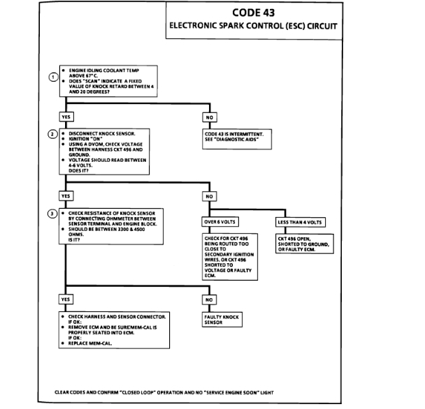 The knock sensor is used to detect engine detonation and the ECM will retard the electronic spark timing based on the signal being received. The circuitry within the knock sensor causes the ECM's supplied 5 volt signal to be pulled down, so that under a no knock condition CKT 496 would measure about 2.5 volts. The knock sensor produces an A/C signal which rides on the 2.5 volts DC voltage. The amplitude and signal frequency is dependent upon the knock level. If CKT 496 becomes open or shorted to ground, the voltage will either go above 3.5 volts or below 1.5 volts. If either of these conditions are met for 20 seconds, a Code 43 will be stored.