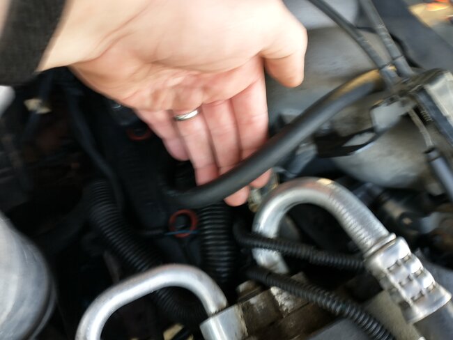 Used carb cleaner, did not detect any vacuum leaks. Did find a line going into side of motor (on left side facing) which pulled out very easily and was very dirty (see pictures). Not sure if this is PCV or if I should try and clean it. I thought PCV was on the other side. Removed IAC, it was pretty gunked up. Used alcohol pad and very gently cleaned exposed spring did not attempt to clean down inside of it. This did seem to make some difference. Ordered new IAC but will not be in till next week. Please forgive me for not knowing the proper names of engine parts, between the fact that the last time I worked on my own vehicle they still had points and condensers and a stroke messed with my memory.