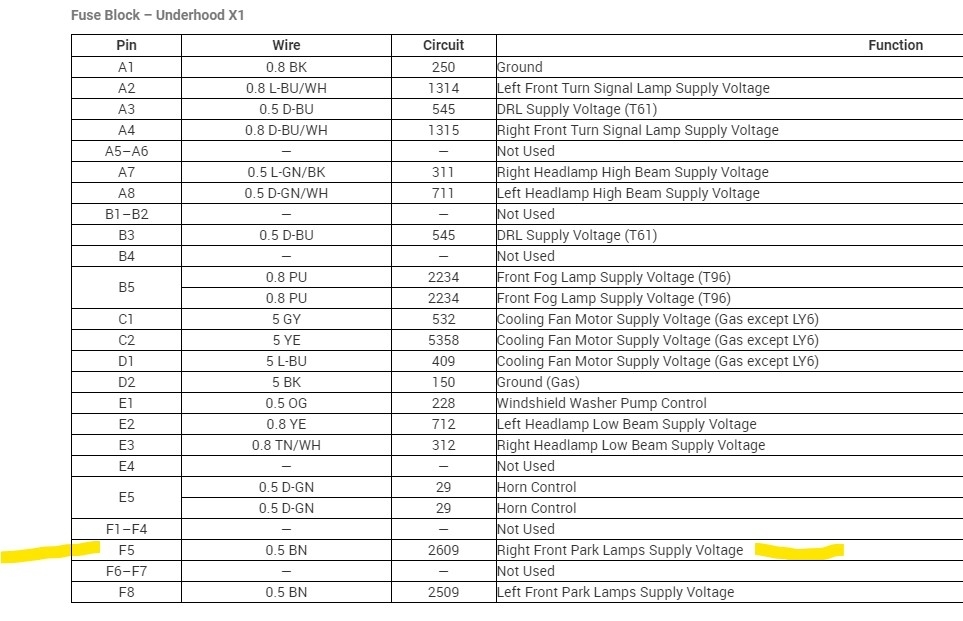 So using my test light on fuse 27, park lamps on (all park lamps on truck are lit), light doesn't light. Park lamps off, no light. Park lamps on, pulled every fuse in the box, rt front park lamps stay on. However I did find that the RT High beam fuse had melted down for some reason though. I'm going to have to chase the wiring this weekend it looks like.