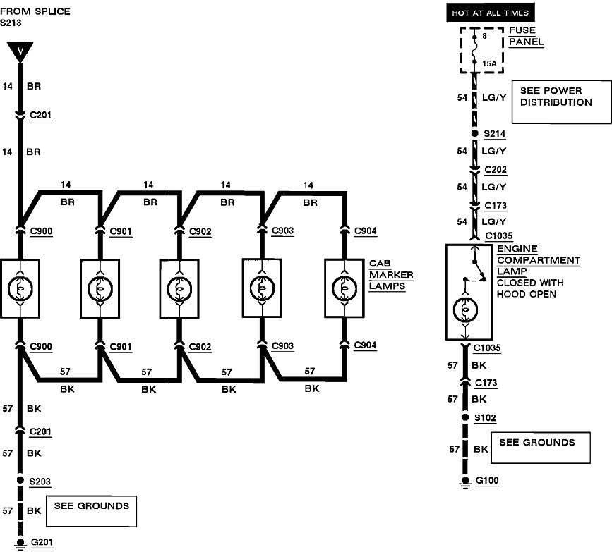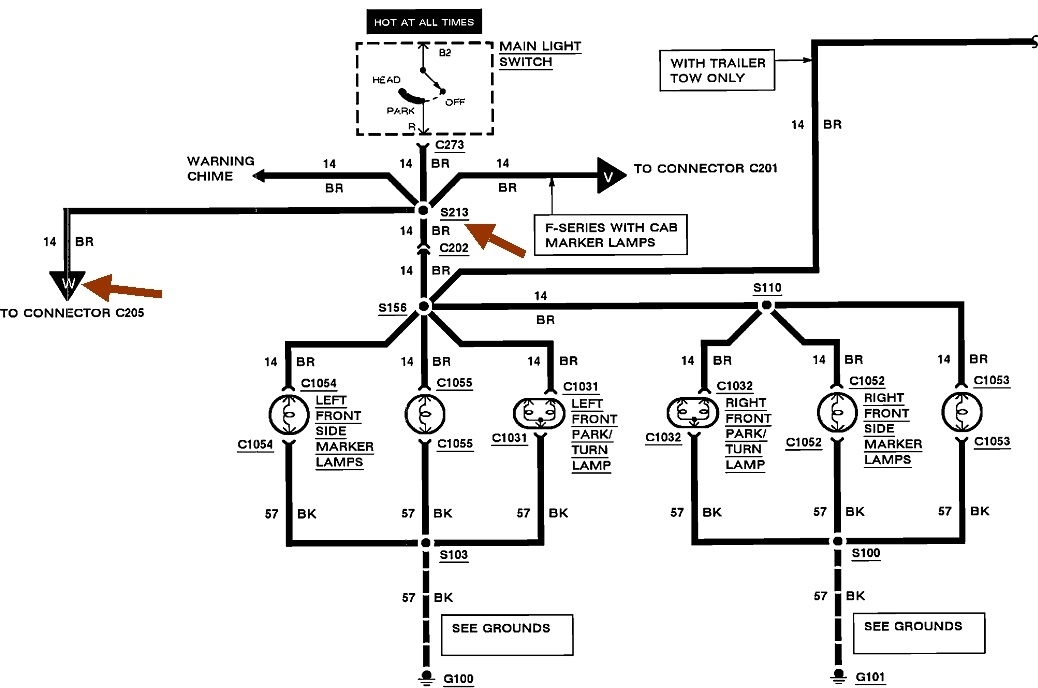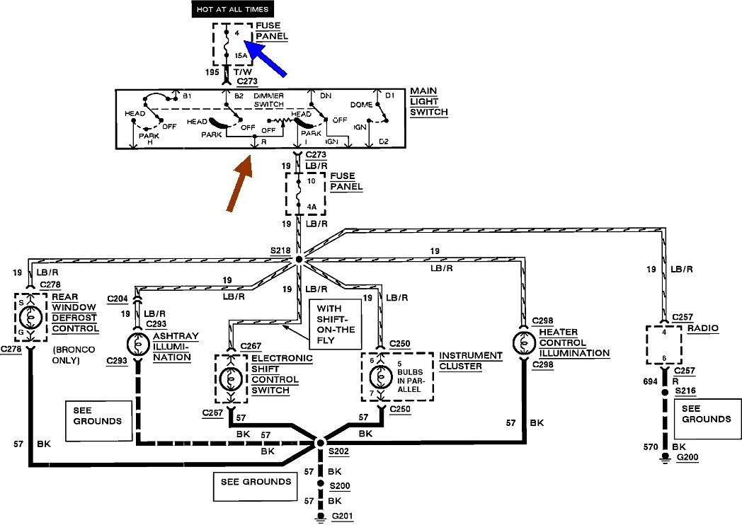 If that's okay, we have to figure out where the voltage is coming from. I posted these diagrams out of order because it makes them easier to follow. The first one shows the dash lights, but what's important is the fuse # 4, (blue arrow), feeding the head light switch. The brown arrow is pointing to terminal "R" that is for the outside running lights. That circuit starts in the second diagram and appears to be the one where some voltage is showing up. The brown arrows are just pointing to the same circuit on multiple pages, where they refer to splice "S213". Point "W" is just used to denote the circuit continues between those two points on different pages, in this case the fourth diagram. Point "V" on the second and sixth diagram are for the roof lights.