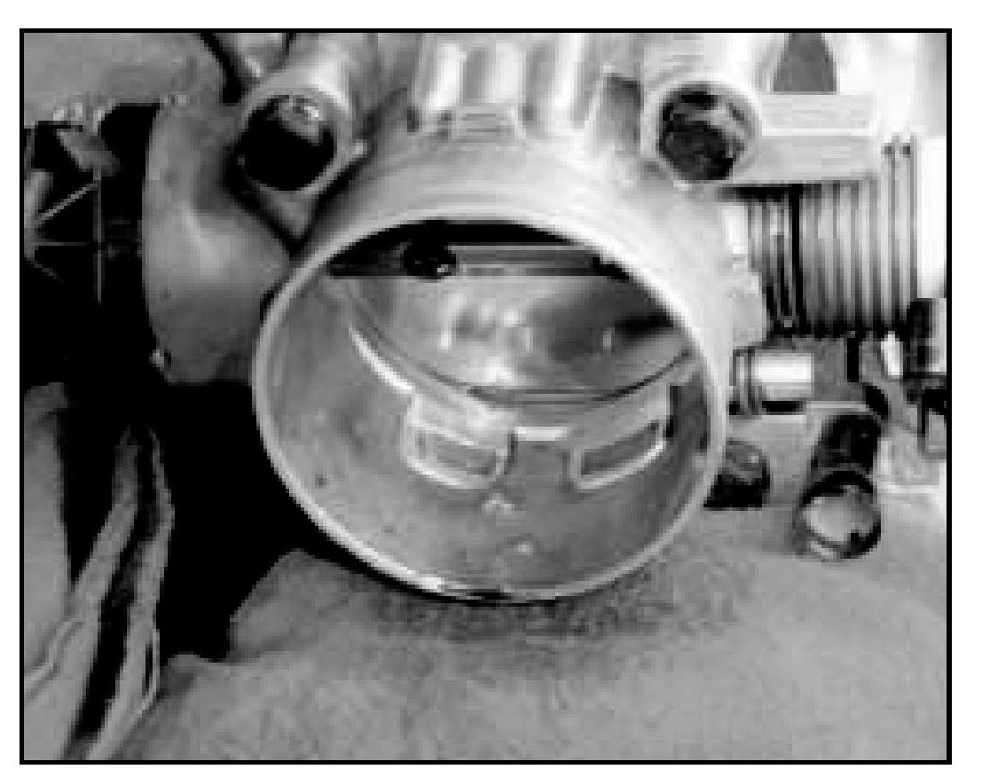 2. Using throttle plate or equivalent cleaner, open the throttle to the Wide-Open-Throttle (WOT) position. Clean out the throttle body bore and throttle plate using a small soft metallic (brass) or stiff bristled brush as necessary.
