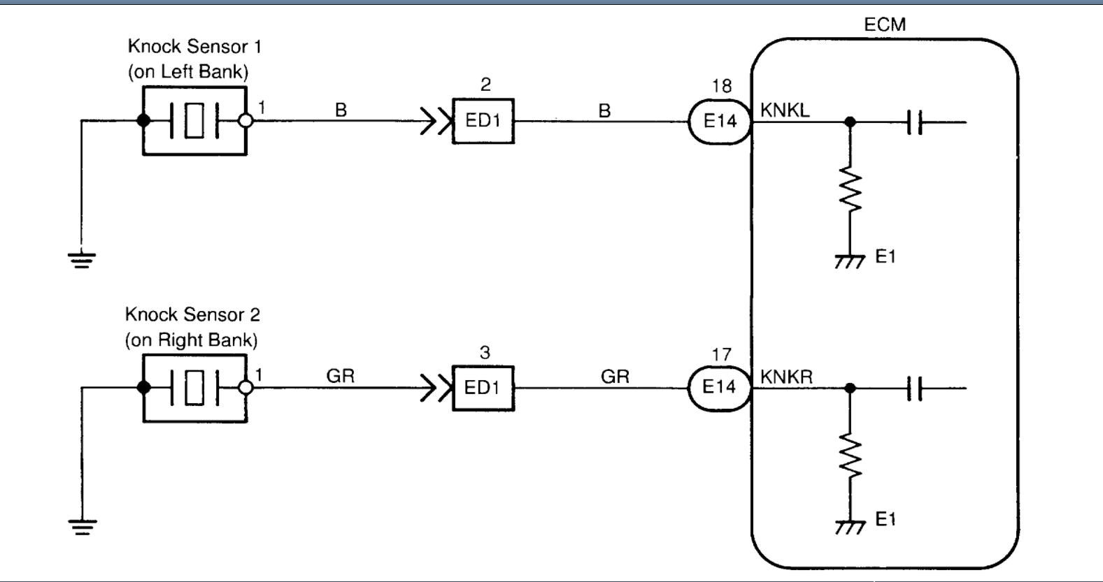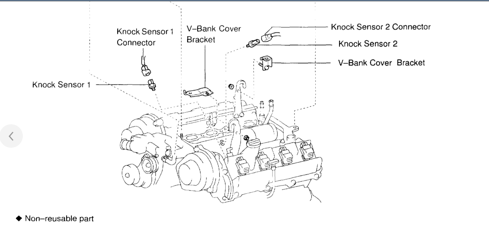 Knock sensors are fitted one to the right bank and left bank of the cylinder block to detect engine knocking. This sensor contains a piezoelectric element which generates a voltage when it becomes deformed, which occurs when the cylinder block vibrates due to knocking. If engine knocking occurs, ignition timing is retarded to suppress it.