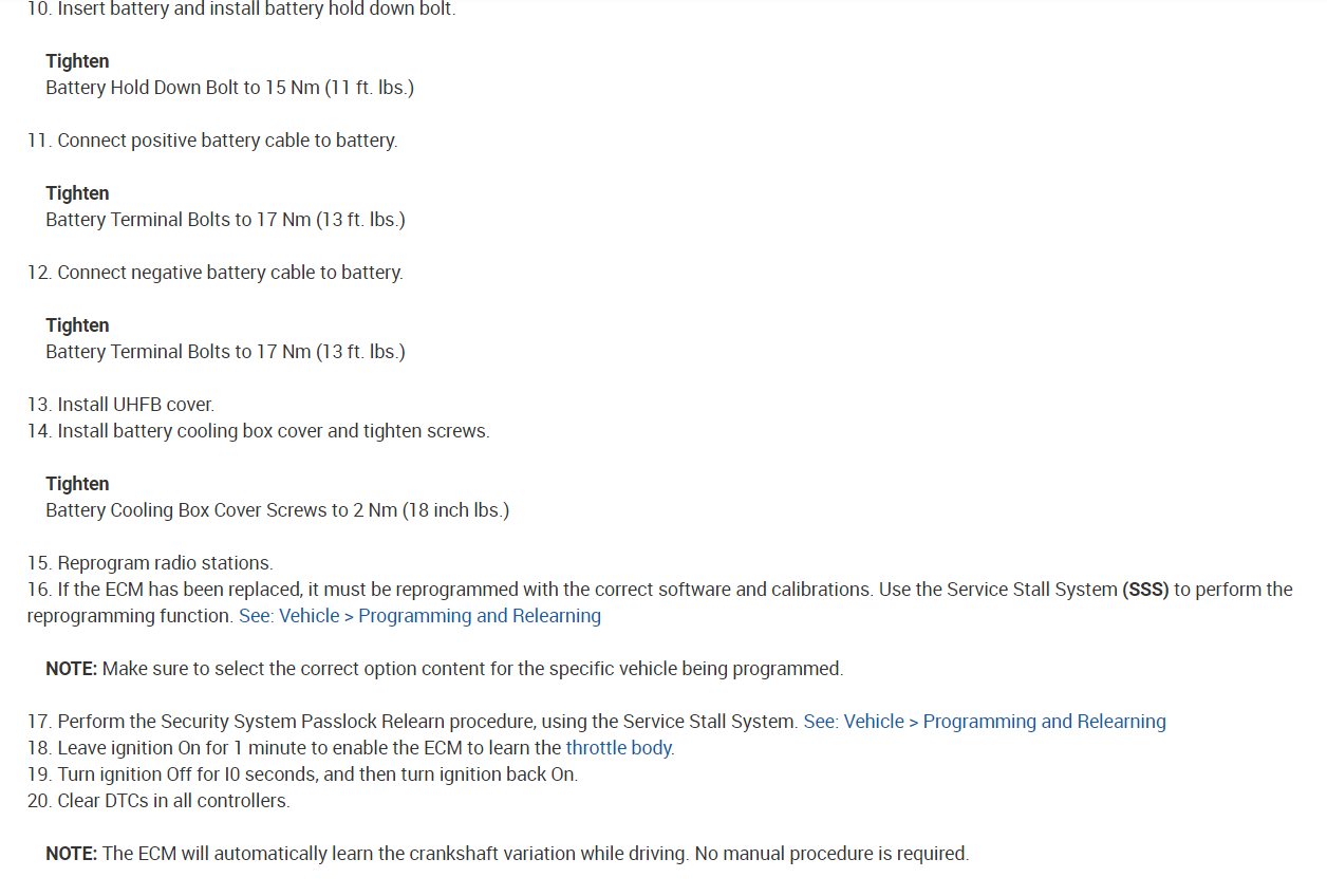 The ECM also has the ability to learn the throttle body, which allows it to learn the 0% and rest (7%) TP sensor position values as well as ensure both return spring rates within the throttle body are within acceptable limits. The ECM will automatically relearn the throttle body if the ignition is turned On for longer than 29 seconds with the ECT and IAT above a certain range (see Minimum Throttle Position Not Learned DTC). The ECM will automatically relearn the throttle body upon key-up if the battery is disconnected or the ECM has been replaced or reprogrammed. The throttle body should always be relearned if a new throttle body or ECM has been replaced. To relearn, key-up for 1 minute with the ignition On, engine Off while keeping foot Off accelerator pedal.
