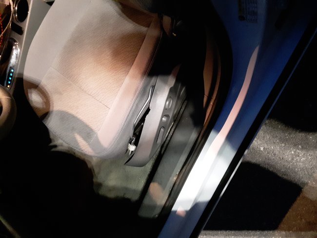 Here's a picture of the driver's side seat. You may have to turn it sideways. The same thing is coming loose on the passenger side. I don't know what to do. Might have to duct tape it.