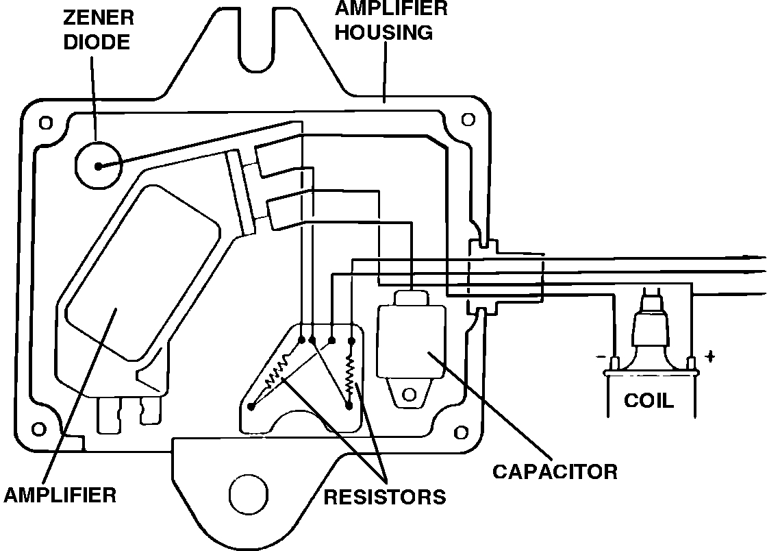 Connect a voltmeter between the positive terminal of the battery and the negative terminal of the 'MAIN' HT coil. Switch the ignition on, the voltmeter should indicate zero volts. Crank the engine, the voltmeter reading should rise between 2 to 3 volts. If the voltmeter reading remains at zero the amplifier is suspect.