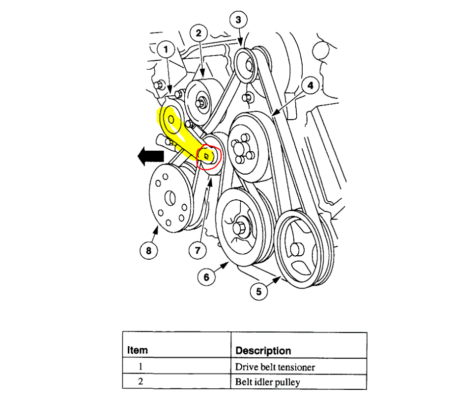 The pic below shows the belt routing for your vehicle. I highlighted the belt tensioner and circled where you will place a wrench to move the tensioner. To loosen tension, apply pressure in a clockwise direction.