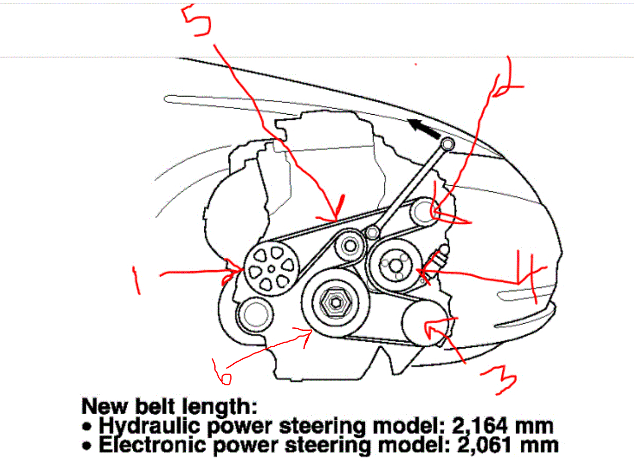 Note: Pic 2 has the same components minus number 3, the A/C compressor. This pic is for a vehicle without air conditioning.